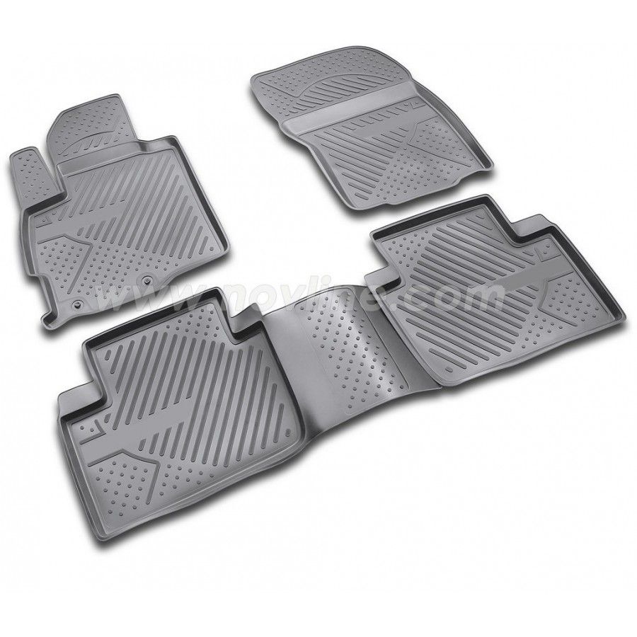 The main function of rubber mats is to protect the car's cabin from dirt and moisture. This is achieved due to the high edges, the crosspiece that protects the drive shaft tunnel in front of the back seat, the shape, properties of the material, and because of the 3D technology used to design the mats. This ensures extra protection, keeping the cabin completely clean.