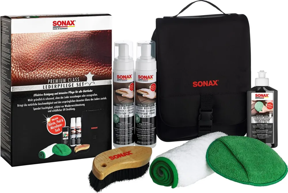 Complete set for thorough cleaning and care of leather delivered in a resealable Sonax bag. The set has a special quick and intensive effect, thereby protecting the leather as much as possible. Removes even stubborn dirt such as grease and stains. Cleans very deeply in combination with the included cleaning brush, even on heavily grained leather. Once the set is used on the leather, it provides long-lasting protection against soiling and harmful UV exposure. The set includes 2x Sonax Premium Class leather cleaner (250 ml), 1x cleaning brush, 1x Sonax microfiber cloth (very fine), 1x Sonax Premium Class leather care (250 ml), 1x Sonax maintenance pad.