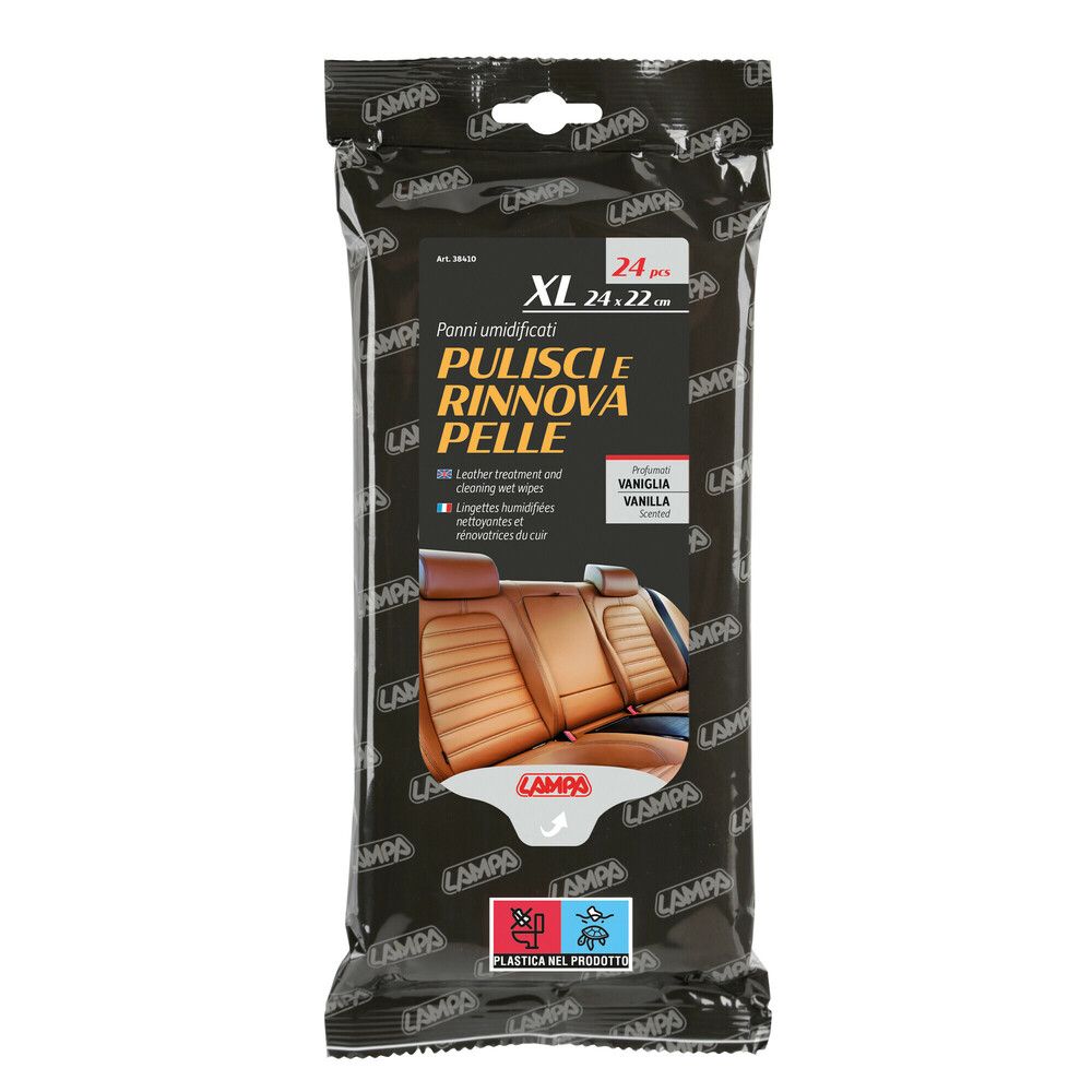Cleaning wipes for quick and easy cleaning of leather surfaces. The formula protects against aging, cracking, and UV rays. It leaves the leather soft and smooth without making it sticky or slippery. Perfect for heated and ventilated seats. Leaves a pleasant vanilla scent.