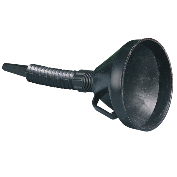 2-in-1 Funnel. Flexible funnel with strainer. Detachable pouring spout. Made of petrol and oil-resistant black plastic.