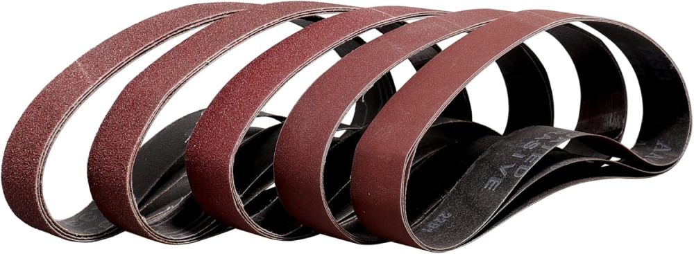 The sanding belt set includes grit sizes 60/80/120/240/400 and consists of a total of 15 sanding belts in the size 30x533 mm, covering most needs for daily sanding and polishing. The belts are made with an X-weight backing, open aluminum oxide abrasive grains, and a high-quality resin-on-resin bond, ensuring even grain distribution as well as fast and long-lasting sanding. The joints are precisely made with a two-way joint and beveled cut, eliminating overlap so the transition remains flat and strong and does not easily break under pressure.