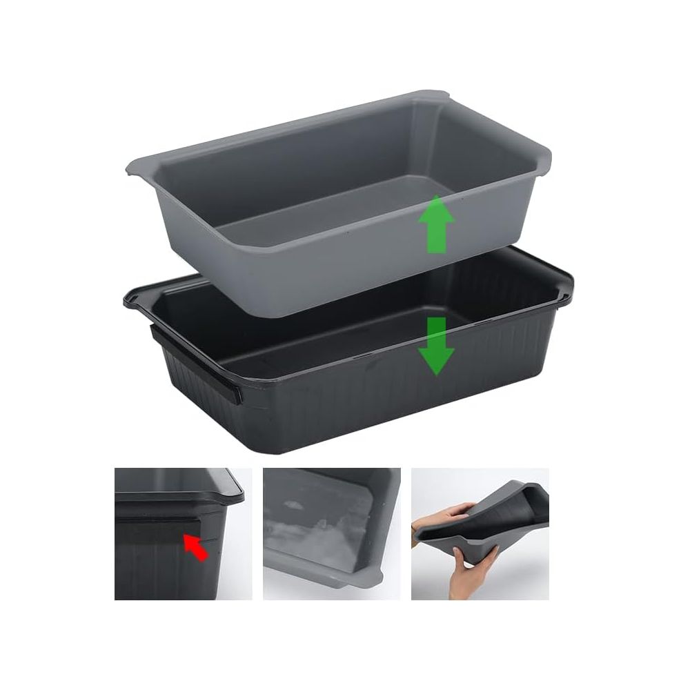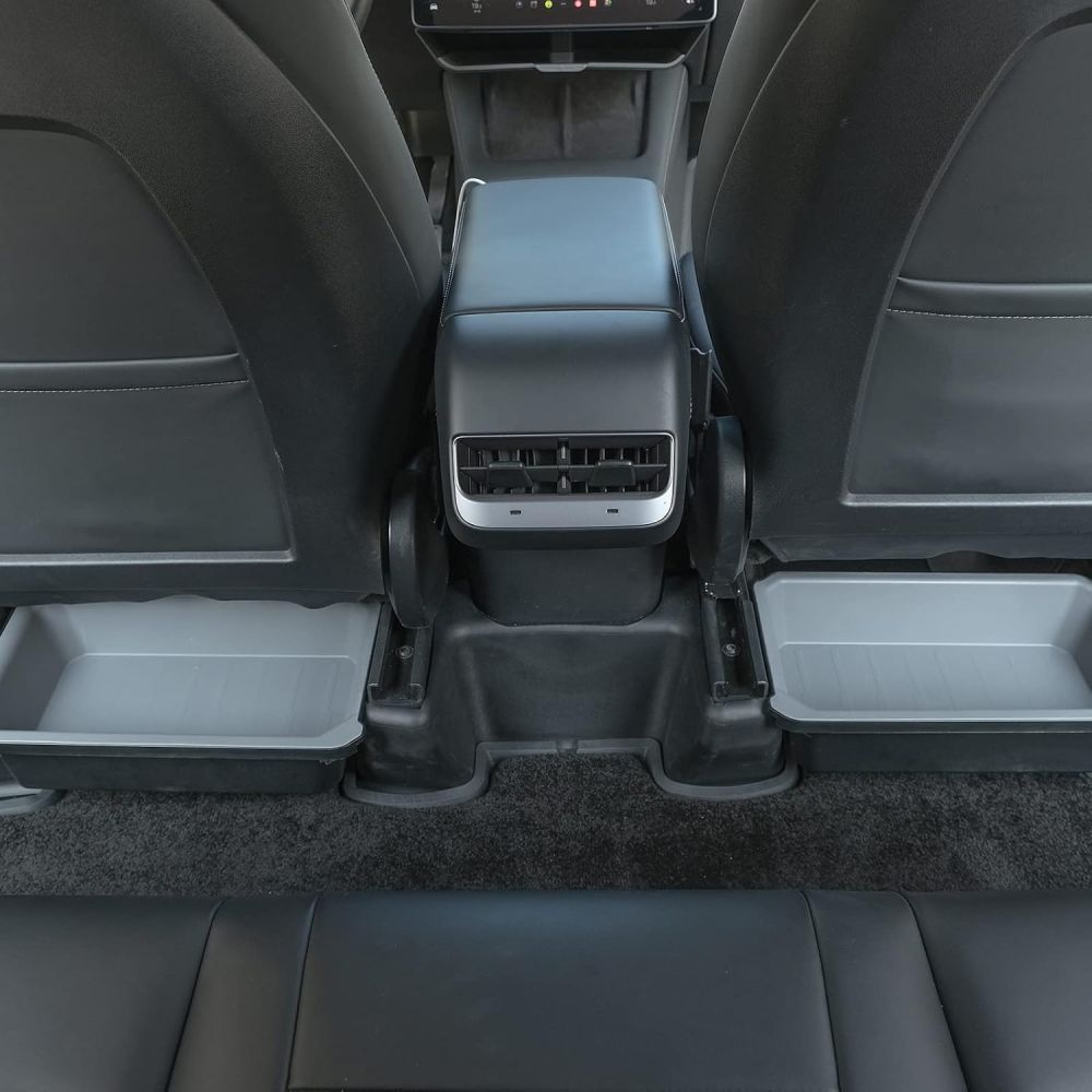 This newly developed and improved storage box can be installed both in front and behind under the front seats and fits most types of floor mats. It is specially designed for Tesla Model Y from 2020 to 2024 and optimally utilizes the car's original space without affecting the seats' function. The box also prevents small items from rolling under the seat and provides tidy and practical storage. The robust two-layer construction combines an outer layer of black ABS with an inner layer of TPE, making the box both sound-dampening, durable, and water-repellent.