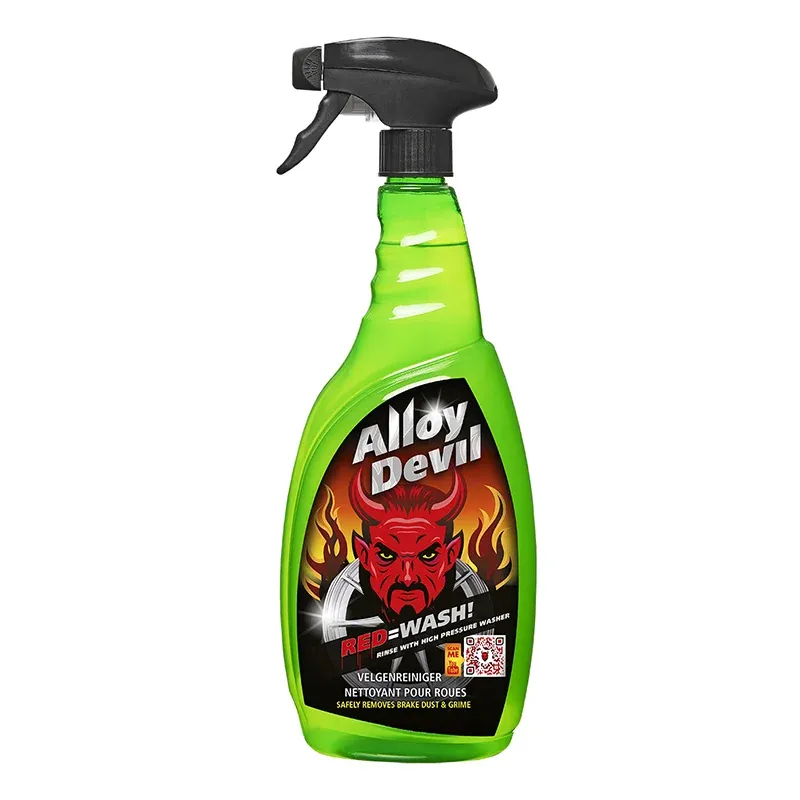 Alloy Devil is a new type of wheel cleaner that safely removes brake dust and contamination from polished aluminum and anodized wheels without any issues. The wheel cleaner cleans without the use of harmful acids. This product complies with the law on the environmental friendliness of cleaning agents and is biodegradable. The special Alloy Devil wheel cleaner has a protective effect on steel and aluminum wheels. This product is PH-neutral. To use the wheel cleaner, turn the nozzle to "ON". Then spray on your dirty wheels. The dirt loosens within a few minutes. During this process, the dirt turns a red/purple color on the wheel. Afterwards, the wheel cleaner should be pressure washed off or rinsed with a strong water jet. Repeat the above actions if one round is not sufficient.