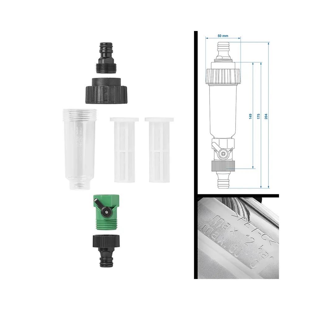 Contents: 1x water filter, 1x extra filter insert, and 1x quick coupling with control valve