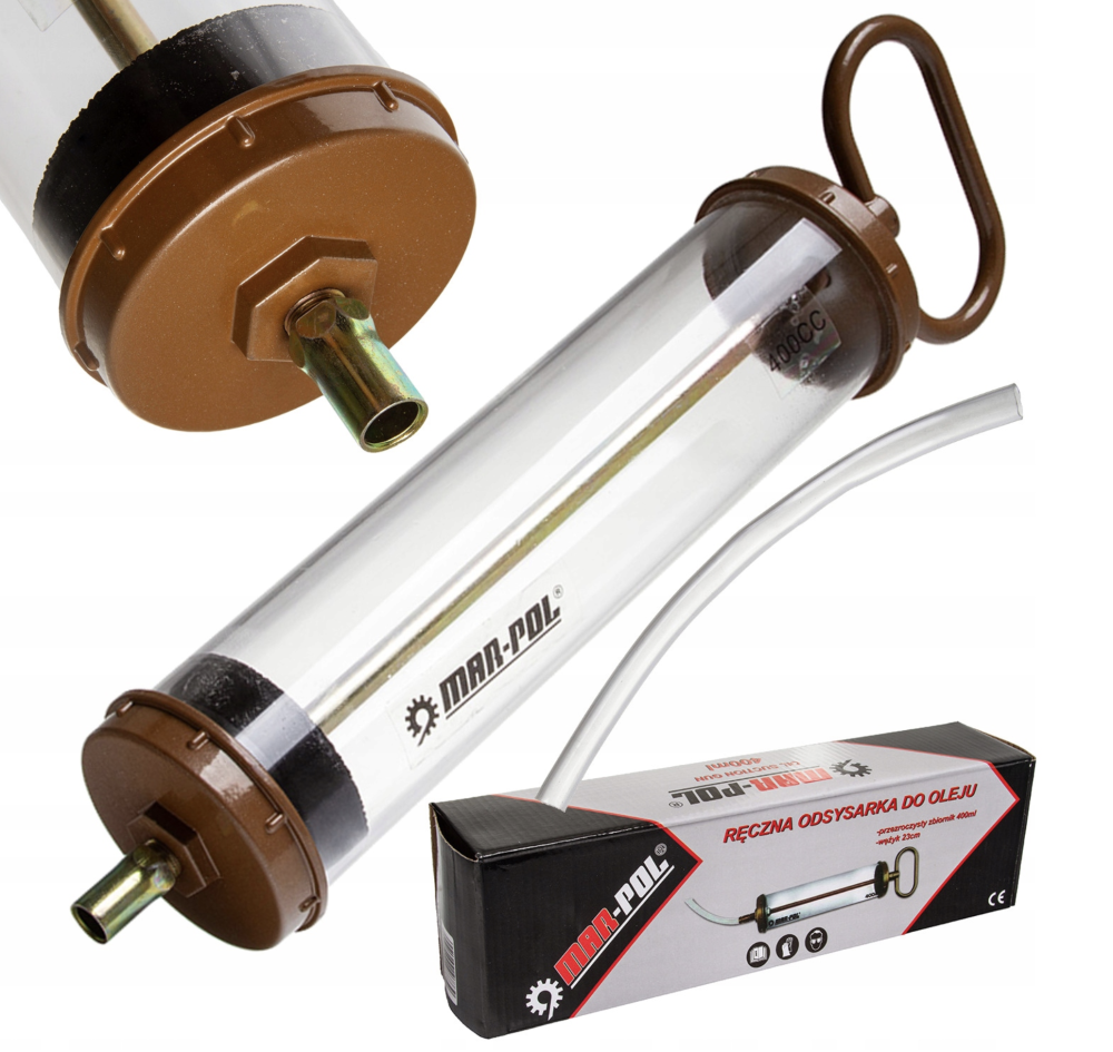 Manual oil suction pump with a capacity of 400 ml, designed for both filling and extracting oil from hard-to-reach areas such as gearboxes, differentials and other sealed components. The transparent container makes it easy to monitor the amount of fluid during use. The oil suction pump features a solid and durable construction as well as a large, ergonomic handle that ensures a secure grip and comfortable operation.