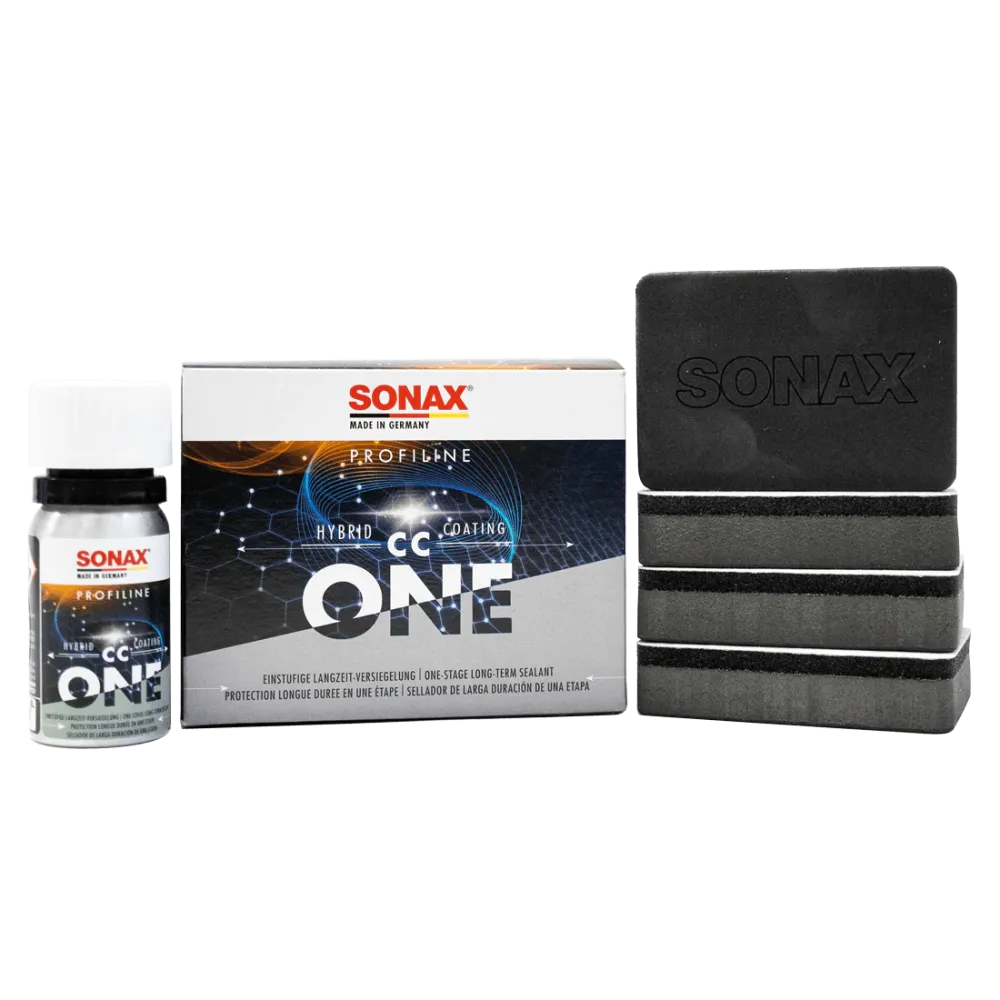 Sonax has developed a powerful weapon to keep the paint's unique appearance shining. Modern paint is an extremely condensed chemical system. Its molecules are held together by strong atomic bonds formed during curing. With 1-step Hybrid Coating CC One, Sonax has developed a true team player that effectively strengthens the car's paint and provides a protective layer. Sonax Hybrid Coating CC One activates the cohesion of forces and optimizes their effect with just one application. The special application sponges ensure that the Si-Carbon technology works over a fine surface. The result of this unique interaction is a color-deep protective paint shield that lasts up to 15 months. The surface becomes extremely smooth and waxy soft. Using this kit allows for 2 treatments.