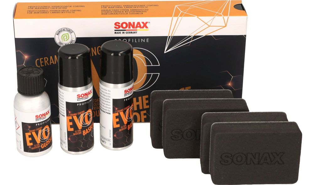 Sonax Profiline CeramicCoating CC Evo is a professional ceramic paint sealant developed for long-lasting protection and maximum gloss. The product is based on advanced Si-Carbon technology and forms an extremely hard-wearing, chemical-resistant layer on the paintwork. The CC Evo system is designed for professionals and is known for its high resistance to UV rays, weather exposure, road salt and aggressive cleaning agents. The surface gains a pronounced hydrophobic effect, causing water, dirt and insects to bead off more easily making daily washing both quicker and gentler. The result is a deep, mirror-like finish and paint protection that, when applied correctly, can last for up to several years.