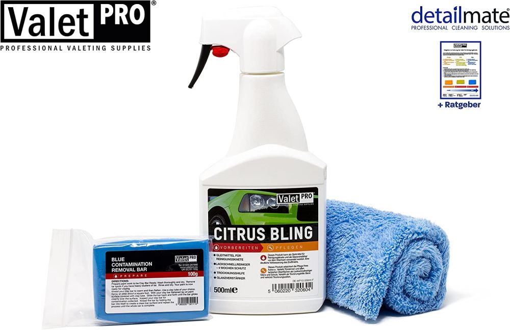 In the long run, these substances will also accelerate the oxidation of the paint. ValetPro Clay Bar Kit easily and safely removes all impurities trapped in depth by rubbing the "clay sponge" on the surface along with the lubricant. The kit contains 1x ValetPro Citrus Bling 500 ml. / 1x ValetPro Clay Bar Blue 100 gr. and 1x Detailmate microfiber cloth 40 x 40 cm, without edge.