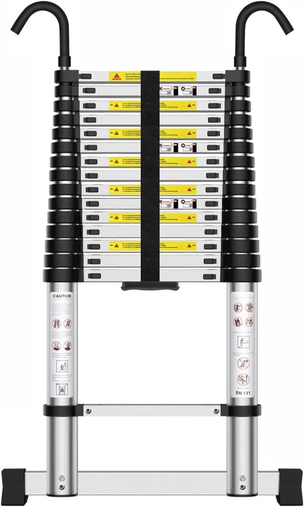 The telescopic ladder is only 1.18 m tall when folded. It can be stored in the basement, attic, or storage room to save space and ease transportation. The ladder features a foldable design with a height of 6.2 meters and a total of 16 steps.