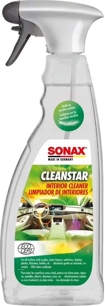 The material-friendly cleaner for all surfaces inside the car - such as glass, upholstery, plastic, alcantara, leather, etc. Gently removes even stubborn stains and leaves a pleasant fresh scent. Also ideal for streak-free cleaning of glass surfaces, sensitive touchscreens, and piano lacquer. Includes odor remover. CleanStar Ecocert - which means it is Ecocert approved, an international certification that ensures the product meets strict environmental standards.