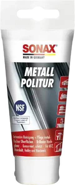 The abrasive, consisting of highly effective alpha-aluminium oxide, quickly and thoroughly removes dirt, rust, tarnished and dull spots from all metal surfaces such as chrome, stainless steel, aluminium, copper, and brass without scratching them. At the same time, it leaves a protective film against weathering and prevents rapid tarnishing. Suitable for cars, two-wheelers, household, hobby, gastronomy, and crafts.